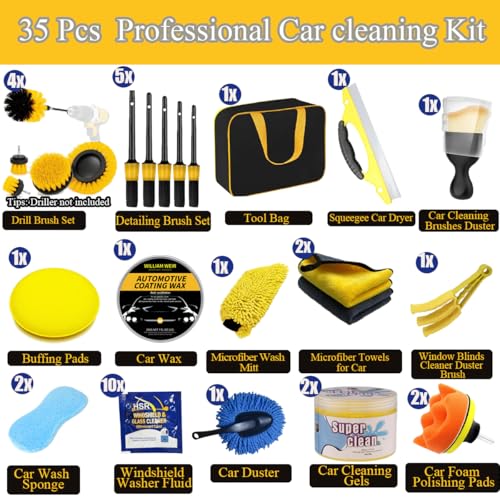 🚗【35 Pcs Car Detailing Kit】Our 35 pcs car detailing kit includes 1 microfiber wash mitt, 1 tool bag, 1 detailing brush set, 1 drill brush set, 1 squeegee car dryer, 1 window blinds cleaner duster brush, 1 car foam polishing pads, 2 car cleaning gels, 2 microfiber towels for car, 1 car duster, 10 windshield washer fluid, 2 car wash sponge, 1 car cleaning brushes duster, 1 buffing pads, 1 car wax!(Driller not included)