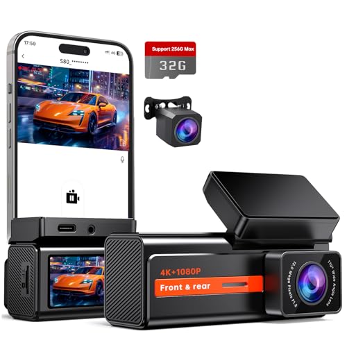 4K Dash Cam Front and Rear Camera, Veement Dash Cam, Mini Car Camera 4K+1080P Dashcam with 1.47” Display, 170°Wide, Night Vision,24H Parking, G-Sensor,Loop Recording with 32G Card Dash Camera