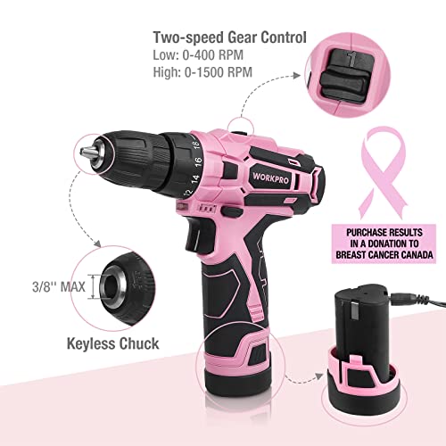 WORKPRO 12V Pink Cordless Drill Driver Set, 18+1 Torque Setting, Electric Screwdriver Driver Tool Kit, 3/8″ Keyless Chuck, Charger and Storage Bag Included