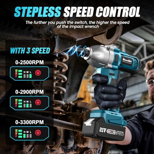 【53.5% More! High-Efficiency Brushless Motor】Seesii Electric Impact Gun adopts high-efficiency brushless motors, the operation becomes more stable and stable. It provides 2-speed mode and up to 3300 RPM, saves your time and energy, suitable for tires removal, automotive repairs and construction projects. Many professionals and DIYers are moving in the direction of brushless motors, enjoying a longer running time of 53.5% and a more efficient experience.
