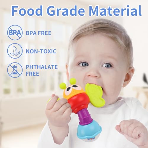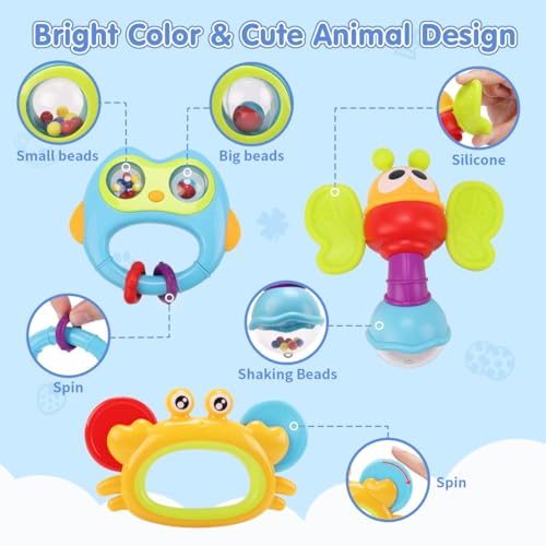 【BPA Free and Safe to Chew】BPA free. Rattle teether set baby toy is made of durable food-grade silicone & BPA-free plastic, non-toxic ABS material. Smooth edges, Burr-free and strong enough to withstand chewing and large enough to avoid choking hazards. They are perfect teething toys for babies 12 months.