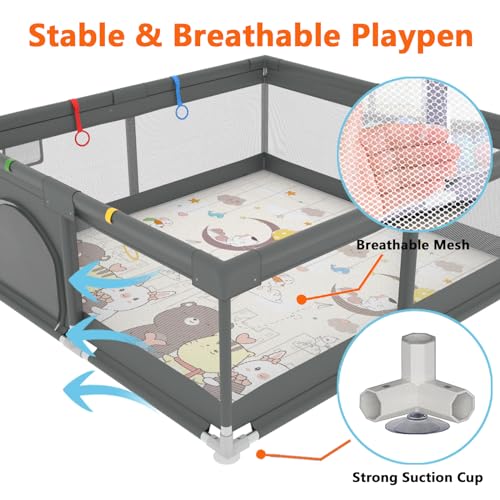 ⚽【Premium Quality Playard with Mat】- Our toddler playpen is made of eco-friendly durable reinforced oxford cloth,soft breathable mesh,high strength Iron pipe and connnectors,4 non-slip suction cup base on the bottom enhances stability of the baby play yard.Upper steel pipes wrapped by sponge make the baby play area softer and more comfortable,baby bumped will not be injured.
