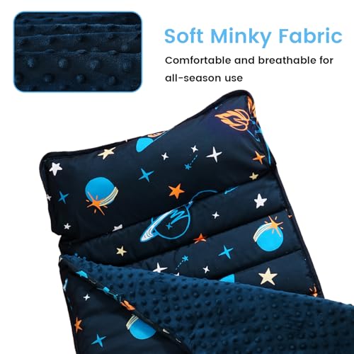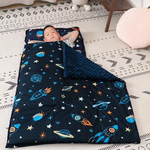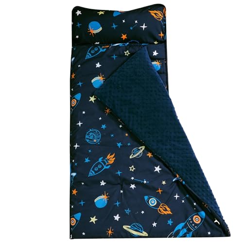 david’s kids Toddler Nap Mat with Warm Minky Dots Lining, Ultra Soft Slumber Bags for Boys, Perfect for Preschool, Daycare, Kids Sleeping Bags with Rollup Design, 50″x20″, Space