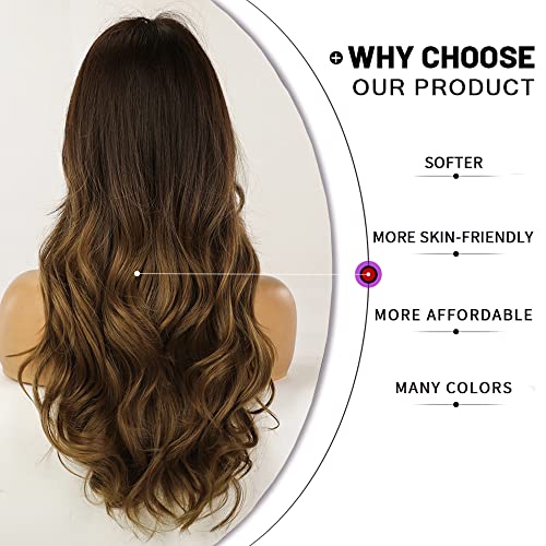 Esmee 24″ Brown wig Synthetic Wigs for Women Dark Roots Long Wig with Bangs Ombre Wavy Hair halloween party Realistic Simulation Scalp Middle