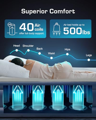 IMPROVED COMFORT & SUPPORT: Experience a relaxing night’s sleep with our mid-rise 13-inch air bed featuring 40 structured air coils that provide the correct support for your spine. No more dips and bulges common in other air mattresses – experience superior comfort with a 227kg weight capacity, ideal for 2 adults.