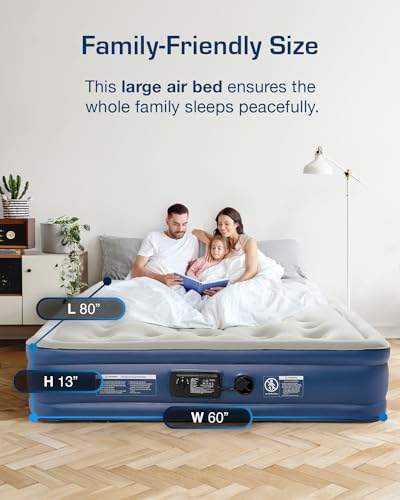 EFFORTLESS INFLATION & DEFLATION: The integrated electric air mattress pump inflates the queen mattress to firmness in less than 3 minutes, making setup a breeze. With a quick switch, the queen air mattress automatically deflates in record time. The bottom of the double air mattress also has a non-slip layer that prevents shifting and reduces noise, ensuring a peaceful night’s sleep.