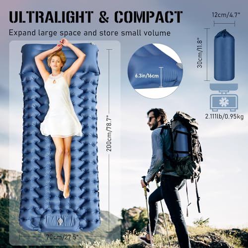 【Sleep Comfortably】79″×28″ inflatable camping mattress provides you with a spacious resting space and up to 4 ” thickness for maximum comfort. The unique air chamber design ergonomically supports all of your pressure points, perfect for avoiding discomfort caused by uneven floor effects, allowing you to provide superior support and overnight comfort in any sleeping position.