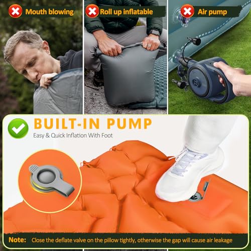 【Only 30s Step to Inflate & 1s Deflate】 Including an innovative built-in foot pump- Just pedal 30-60s to fully inflate the camping mat, which is convenient and easy, you no longer need to inflate with your mouth, hands, or carry a pump, and it only takes 1 second to quickly deflate. With the upgraded version of the air release valve with no leaking film, you shall never worry about air leaking!