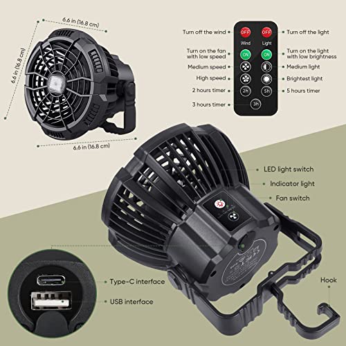 【Bright led light & Hanging hook】—Equipped with a separate light switch of 2 brightness modes, you can use the fan/light only or at the same time. There is a foldable hook on the bottom of the rechargeable fan. You can hang it in the tent, RV or from the ceiling. Designed for outdoor activities, like camping, hiking, yard working. Also can be used indoors as a desk fan.