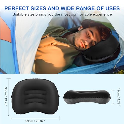 Easy to inflate: New valve structure effectively prevents air leakage. Our inflatable camp pillow is fully inflated in just a few breaths. Open the second layer valve to deflate rapidly. Inflatable size: 53*35*12cm(20.87*13.78*4.72inch)