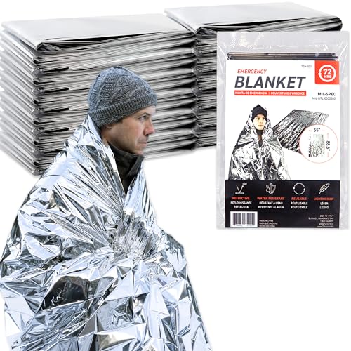 72 HRS MIL-SPEC Emergency Space Blankets Mylar Survival or Emergency Thermal Blankets for Camping, Hiking, Marathon, First Aid, Emergency Preparedness, Extreme Weather, Shelter (12-Pack)