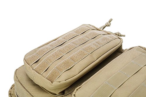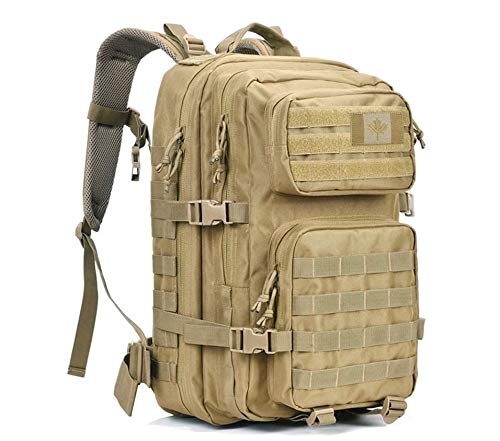 Product Information Brand:Coolton Product Name:Military Tactical Backpack Large 3 Day Assault Pack Color:Khaki Material: durable 600D polyster,water-resistant Size:13″*20″*11″ / 33*50.5*28CM (W*H*D) Weight:3.2 lbs Capacity:40L Product Features Heavy Duty:Heavy duty zippers and utility-style cord pulls;Side and front load compression system Mesh Pad:Ventilated mesh padded back area & shoulder strap,breathable and comfortable Multiple Use:This military backpack can be used as a EDC backpack,weekend used bag,school bag,hiking bag, basic training bag and 3 day rush backpack Compatibilty:It works great for a hydration bladder (hydration bladder NOT included) as hydration backpack Molle System:The molle system allows you to attach additional tactical pouches or necessary gears