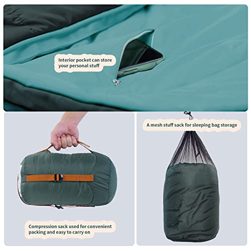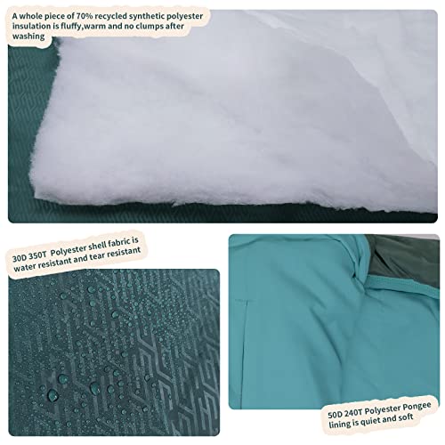 KEEP WARM & COZY: Our mummy-shaped sleeping bag has been expertly designed to keep you warm, even passing the EN ISO 23537-1:2016 temperature test with the ratings Comfort: 1℃(33.8℉), Limit: -5℃(23℉), Extreme: -22℃(-7.6℉).The products are insulated with 2 layers of 70% recycled down-like synthetic polyester to ensure that you have enough warmth to provide a restful night. You can even transform them into a double sleeping bag by simply zipping them both together for optimum heat
