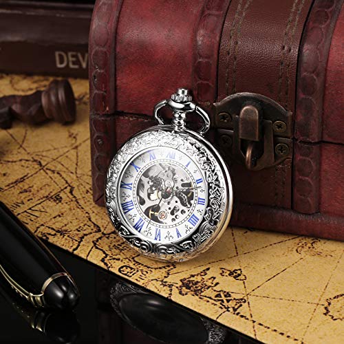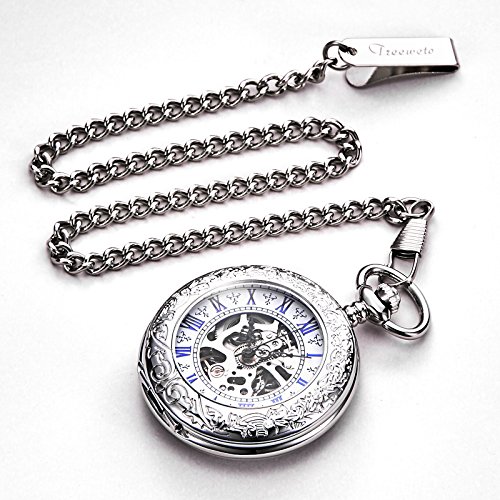 TREEWETO Men’s Steampunk Skeleton Mechanical Silver Fob Retro Pocket Watch