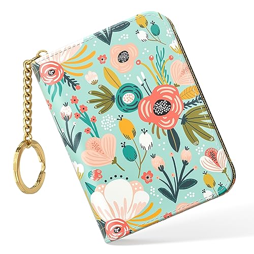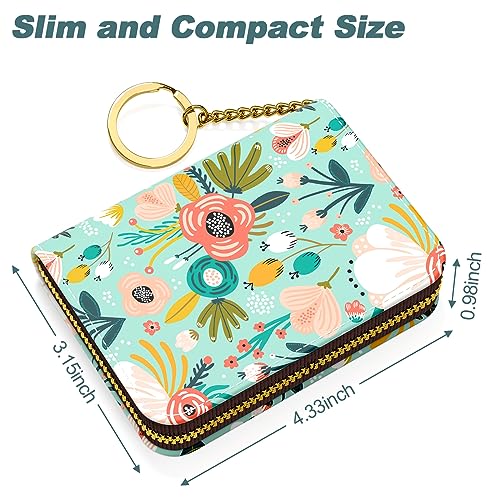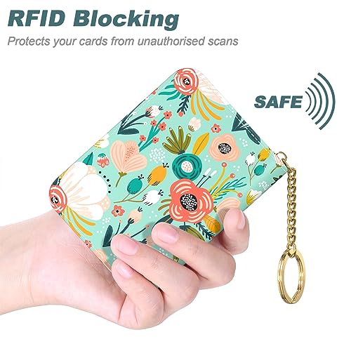 Nipichsha Credit Card Holder, Small RFID Card Wallet for Women, Slim Leather Card Holder Wallet, Credit Card Wallet Organizer, Pocket Business Card Case with Zipper & Keychain, Green Flower, Fashions