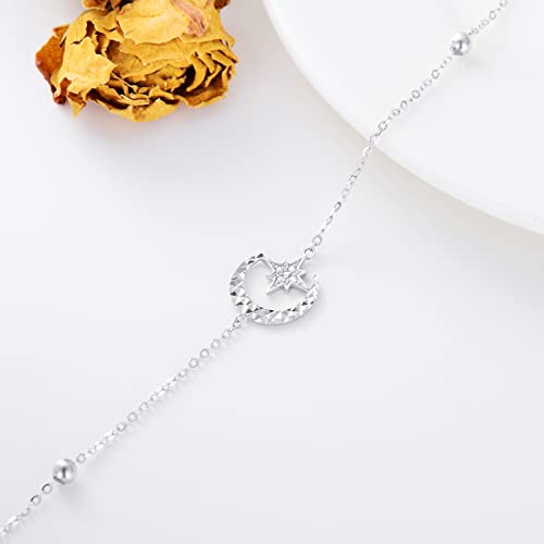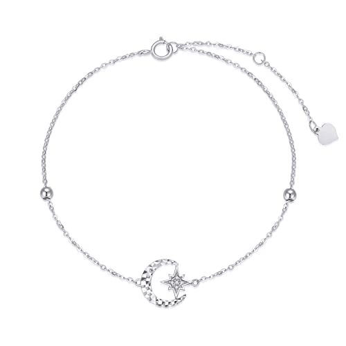 14k White Gold Diamond Moon and North Star Anklets for Women Anniversary Jewelry Ankle Bracelet for Wife, Birthday Gifts for Her 9.4″-11″