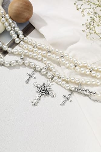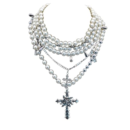 Layered Pearl Cross Necklace Statement Gothic Stacked Rhinestone Pearl Necklace for Wome