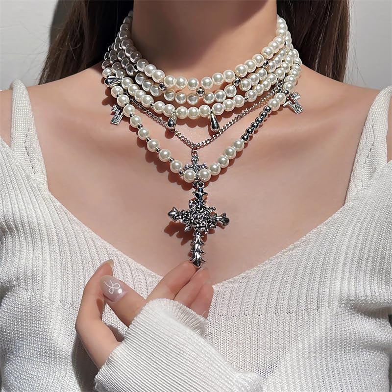 Elevate your style with the Layered Pearl Cross Necklace, a stunning and elegant accessory for women. This statement necklace features a beautiful combination of chunky stacked rhinestones and pearls, creating a gothic yet sophisticated look. Each necklace comes with a 7cm extension chain, ensuring a comfortable fit for all wearers. The timeless elegance of this piece makes it suitable for both casual and formal occasions, adding a touch of glamour to any outfit. The chunky stacked rhinestones and pearls create an eye-catching effect, making it the perfect accessory to showcase your unique and bold sense of style. Whether it’s a gift for a loved one or a treat for yourself, this Layered Pearl Cross Necklace is sure to make a lasting impression. (Warning: Applicable only to individuals aged 12 above)