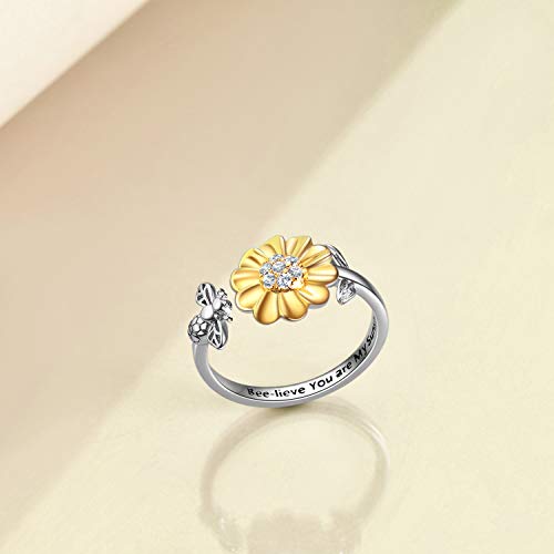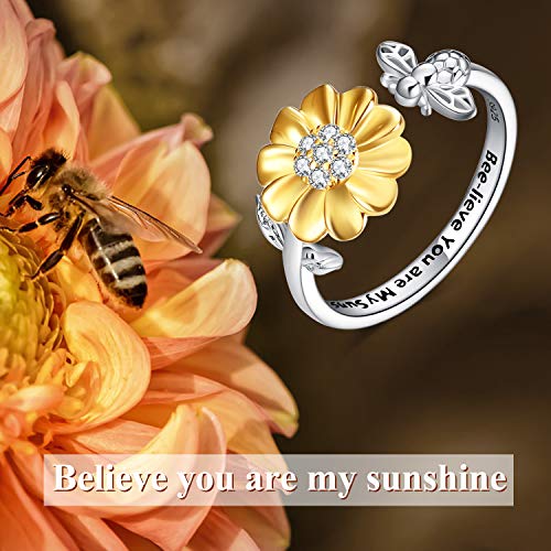 ONEFINITY Bee-live You Are My Sunshine Sterling Silver Sunflower Rings with Bee/Ladybug Open Adjustable Ring for Women, Sterling Silver, Cubic Zirconia