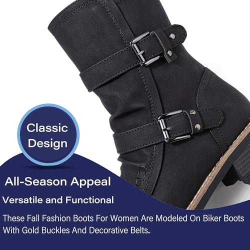 todaysunny Womens Combat Boots Classic Chunky Heels Motorcycle Boots Fashion Buckles Biker Boots Ladies Low Heel Mid Calf Riding Booties Comfortable Non Slip Boots For Women