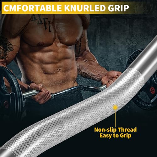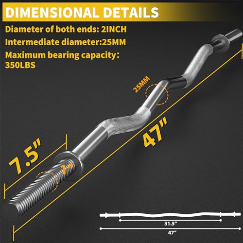 【Specifications】This EZ curl bar is 47 inches long and 25mm in diameter, made of high quality heavy duty solid steel, our Olympic bar can hold up to 300 lbs. The precise medium depth knurling gives this bar a grip that feel glued but not too tough to tear your skin
