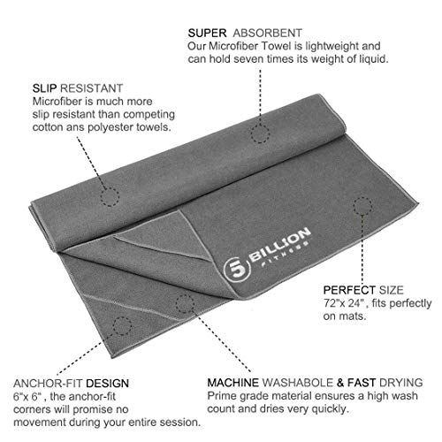 5BILLION FITNESS Yoga Mat Towel 24x72inch,61cm x 183cm Microfiber Hot Yoga Towel with Corner Pocket, Non Slip Yoga Mat Cover, Super Absorbent, Machine Washable, Fast Drying – Free Carry Bag (Gray)
