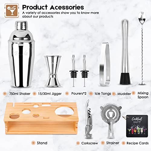 ★ PERFECT GIFT: Beautiful and elegant appearance design, bamboo holder and recipe cards packed together with a pretty gift case, for a fun cocktail mixing experience, this cocktail shaker set is a perfect gift for any professional bartenders or cocktail lover.
