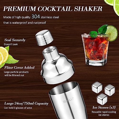 【35 Pieces Complete Bar Set Accessories】 Our cocktail shaker set comes with everything you need to create a wide variety of party cocktails and bar drinks. It includes a 24 oz Cocktail martini Shaker, 15/30ml Double Jigger, Strainer, Ice Tongs, Muddler, Spoon, Liquor Pourers (x4), Bottle Stopper (x2), Reuseable Ice Stones (x3), Straight straw(x2), Bent straw(x2), Fruit pick(x4), Bottle cap (x4),Wine Opener, Bamboo Stand, a cleaning brush, and a Cocktail Recipes Booklet.