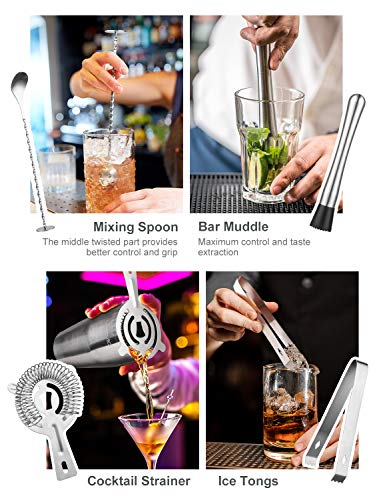 A Good Starter Kit for Bartender: Professional cocktail shaker set includes 10 items with a 24oz (710ml) built-in filter martini shaker, double size jigger with 0.5oz & 1oz, mixing spoon, muddler, ice tongs, corkscrew, hawthorne strainer,2 liquor pourers, a cocktail recipe and bamboo stand, which can make you create cocktail drinks at home conveniently