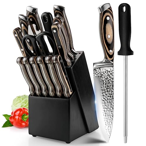 Knife Sets for Kitchen (15 Pieces), Hammered Desgin Knife Set with Block and Sharpener, High Carbon Stainless Steel Chef Knives with Grey Triple Rivet Handle, Ultra Sharp and Dishwash Safe