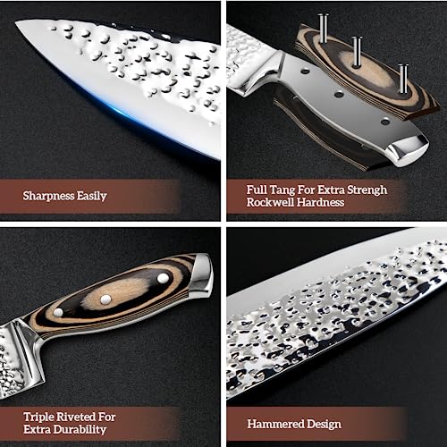 Unique Pattern & Anti-Rust – The unique delicate hammer pattern design can effectively prevent food from sticking and cutting more smoothly, The precise forging process makes the steel finer-grained, making it stronger and harder. This knife block set is durable, anti-rust, and stain resistant, never worry about breaking off.