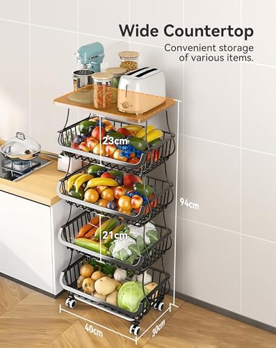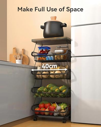 Fruit and Vegetable Rack, 5 Tier Stackable Metal Kitchen Storage Baskets on Wheels, Potato Vegetable Rack Storage Trolley Organizer for Kitchen