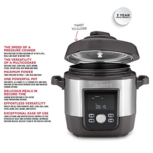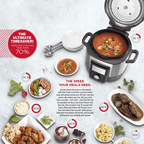 Cuisinart turns up the pressure on this powerful multicooker. Finish a meal faster in pressure cooking mode, with settings reaching up to 15PSI (po2). And more presets make cooking meat, stew, chili, soup, stock, beans, rice, grains – even risotto – easier than ever! Just toss ingredients into the pot and choose Pressure Cook, Slow Cook, Steam or Custom Cook. You can start with Sauté or Brown and continue with Pressure Cook or Slow Cook mode to finish your dish. Under pressure, foods retain more vitamins and minerals, and stay moist and flavourful. Cook confidently with Cuisinart!