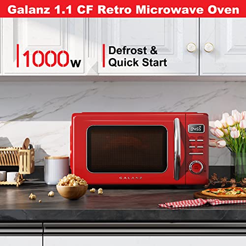 Galanz GLCMKZ11RDR10 Retro Countertop Microwave Oven with Auto Cook & Reheat, Defrost, Quick Start Functions, Easy Clean with Glass Turntable, Pull Handle 1.1 Cu. Ft, Red