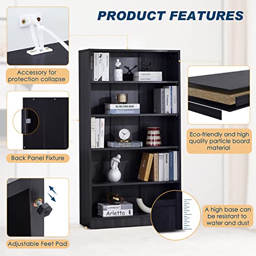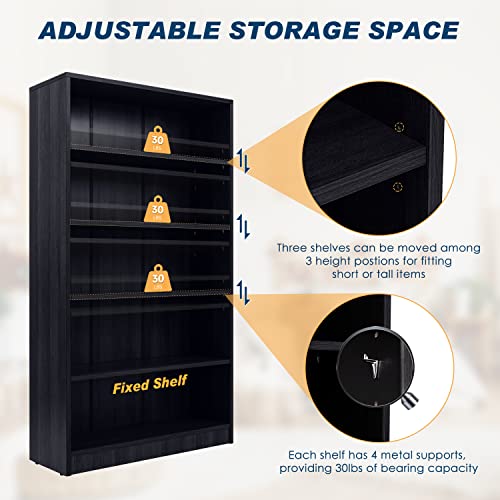 Adjustable Shelf— The five-tier bookcase has 3 adjustable shelves and 1 fixed shelf to maximize storage potential for your storage needs.