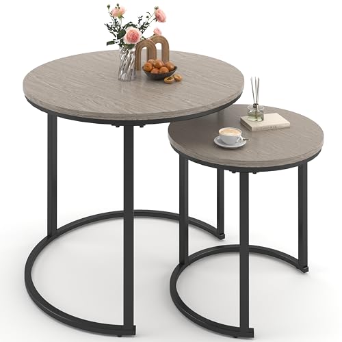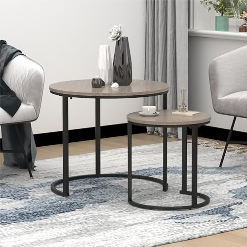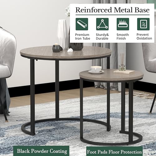 Rustic Nesting Coffee Table with Round Wooden Tabletop, Sturdy Metal Base, Nesting End Table Set for Living Room