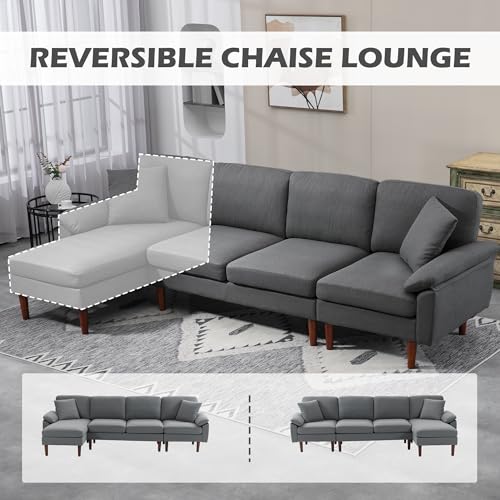 Cozy Time: This L-shaped sofa provides you with the softness, high resilience, and support you deserve with its breathable linen-feel fabric, 5.9″ (15 cm) padded seat cushions featuring high-density foam and a spring pack inside, 7.9″ (20 cm) overstuffed back cushions, 2 extra pillows, and 2 armrest cushions.