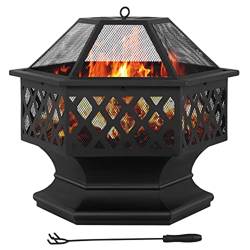 FDW Outdoor Fire Pit 28″ Patio Fire Pit Wood Burning Metal Fire Bowl Round Garden Stove with Charcoal Rack, Poker & Mesh Cover for Camping Picnic Bonfire Backyard,Black
