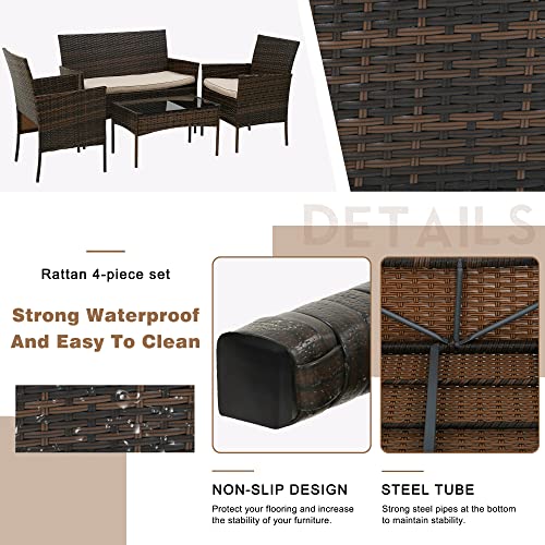 BestOffice Patio Furniture 4 Pieces Outdoor Indoor Use Rattan Chairs Wicker Patio Loveseats Conversation Sets with Table and Beige Cushions for Backyard Lawn Porch Garden Balcony,Brown