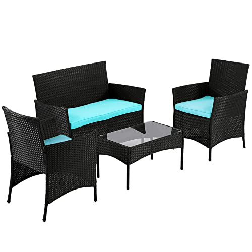 Patio Furniture Set,4 Pieces Outdoor Couch Patio Dining Conversation Set,Rattan Chairs Wicker Sofa with Tempered Glass Table for Porch,Backyard,Lawn,Pool(Blue)