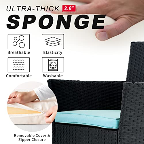 ✿【Comfortable and Practical】Our 4 pieces patio furniture set include 3 rattan chairs and 1 tempered glass coffee table, a highly elastic cushion, which can bring you a comfortable sitting experience to relax your body. The tempered glass tabletop is easy to clean and create a smooth, sturdy surface for food and drinks