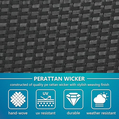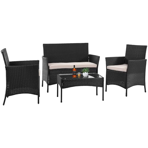 Ruesleag Patio Furniture Set 4 Piece Rattan Conversation Sets Patio Set Chairs w/Thickened Cushions and Tempered Glass Table Outdoor Wicker Porch Furniture for Yard or Backyard,Black