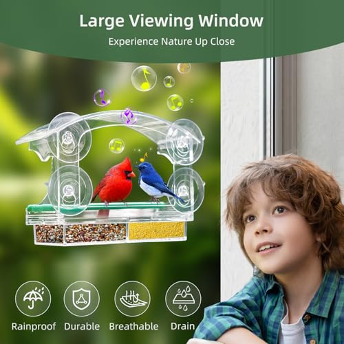 Clear Acrylic Window Bird Feeder with Strong Suction Cups, Window Mount, Removable Tray,a nd Perch – Perfect for Bird Watching, Easy to Clean, Weatherproof – Attracts Various Colorful Birds