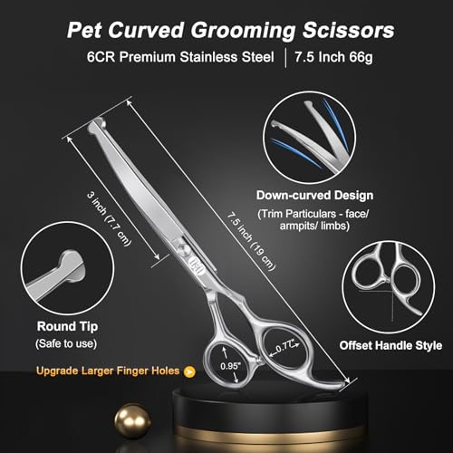 CIICII Dog Grooming Scissors Kit, 7.5 Inch Professional Pet Grooming Scissors Set with Safety Round Tip (Dog/Cat Hair Thinning Trimming Cutting Shears with Curved Scissors) for DIY Home Salon (Silver)