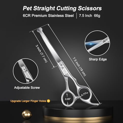 🐶Professional Upgrade Ergonomic Design: ❶Upgrade Larger Finger Holes – From Traditional 0.69-0.85 Inch to Upgraded 0.77-0.95 Inch based on customer recommendations. ❷33 Teeth Thinning Scissors – Sharp and no hair caught between the blades (Thinning rate of 30-35%) ❸Offset Handle Design – Very ergonomic & reduces fatigue. ❹High Rebound Muffler Design – Reduce the metallic noise and friction of scissors. ❺Adjustable Screw Design – Adjust the tightness of the scissors according to our feeling.