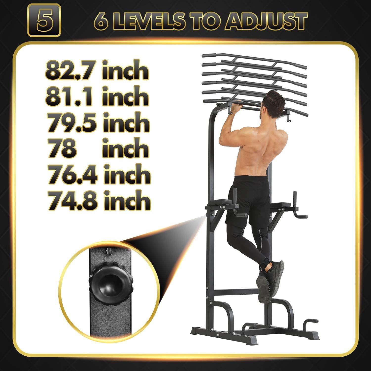 【6 Gear Regulation Height】The height of pull up stand adjustable range is 74.8-82.68”. Adjust the appropriate height according to your height and the place of use (home, office, gym).
