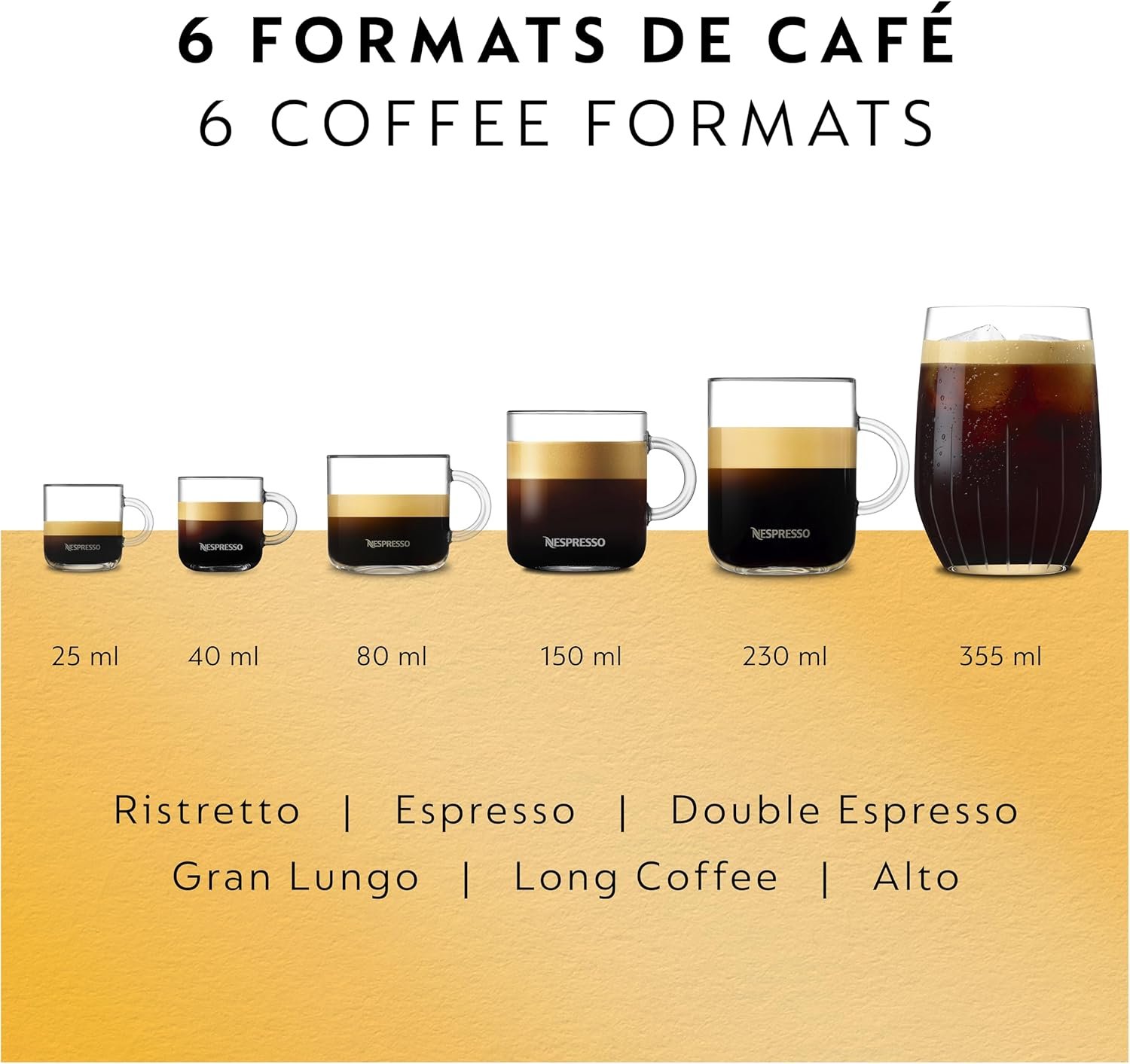 Versatile machine offering 6 coffee sizes (Ristretto, Espresso, Double Espresso, Gran Lungo, Mug/Coffee, Alto & Cold Brew style coffee).