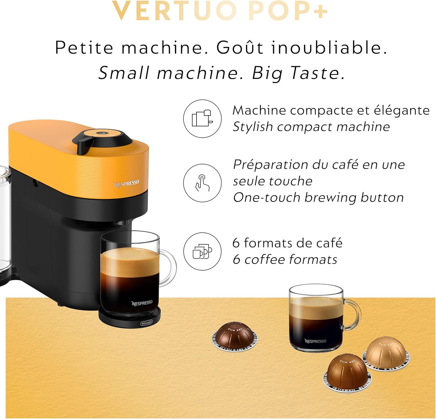Introducing our smallest Vertuo machine ever. Vertuo Pop+ makes a bold statement to complement your unique style. With six coffee sizes, hot or with ice, from Ristretto (25ml) to Alto (355ml) and Cold Brew style coffee, simply choose your Vertuo capsule, pop it in, and get the unforgettable taste of Nespresso. To keep you spinning, the machine reads the code on each pod to reveal its hidden treasures, from aroma to crema. The Vertuo Pop+ has a removable water tank accessible from the side, all in a compact design. Always connected, Vertuo Pop+ updates automatically, ensuring you get a smooth and consistent coffee experience. And to reduce its impact on the planet, it is made from 35% recycled plastic. Vertuo Pop+ will never slow you down thanks to its state-of-the-art connectivity features. Once connected, your machine will stay up to date, ensuring you get a smooth and consistent coffee experience. As a bonus, you’ll surely appreciate the easy maintenance of your machine, from the comfort of your smartphone. VERTUO POP+Small machine. Big Taste.