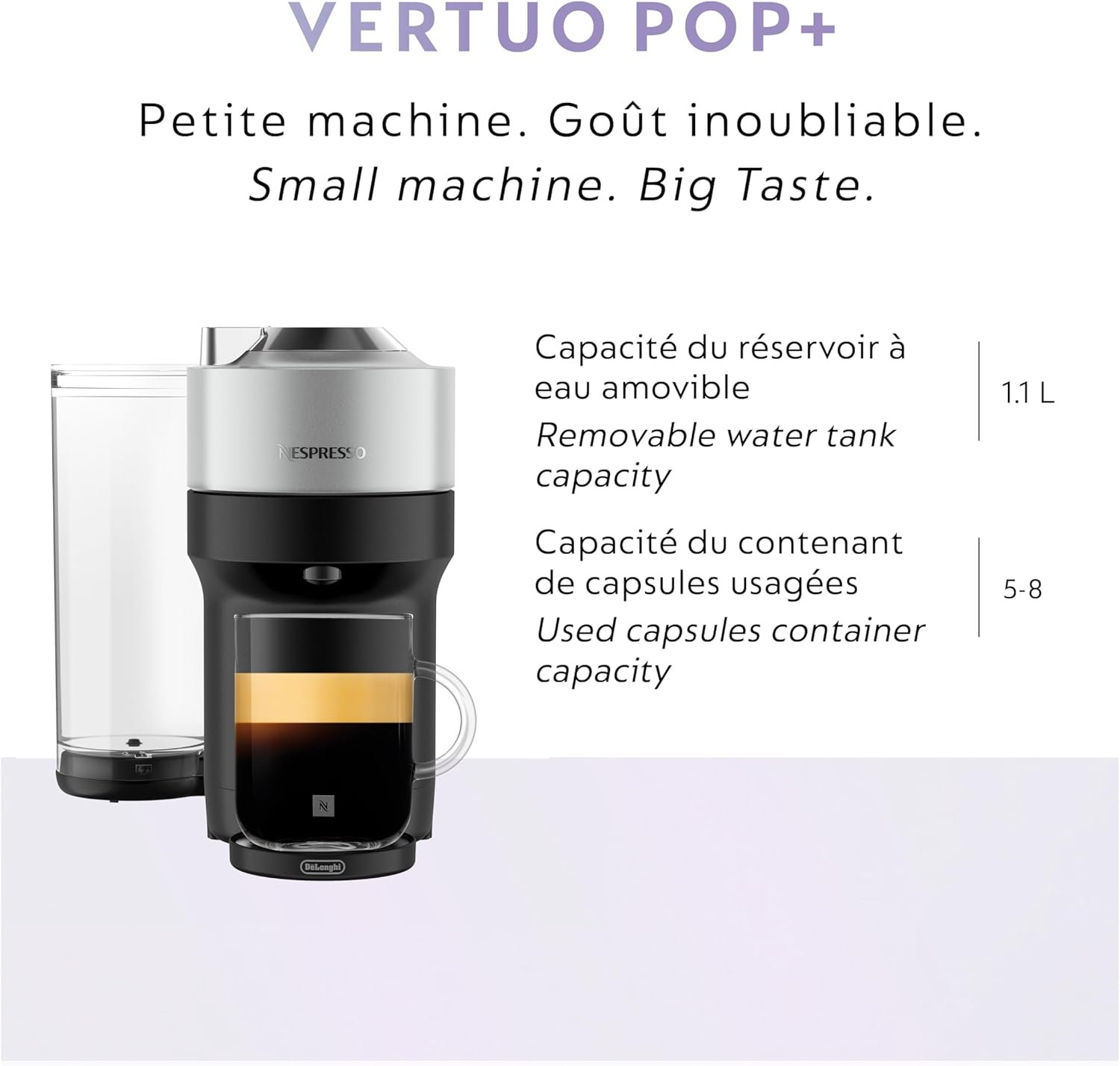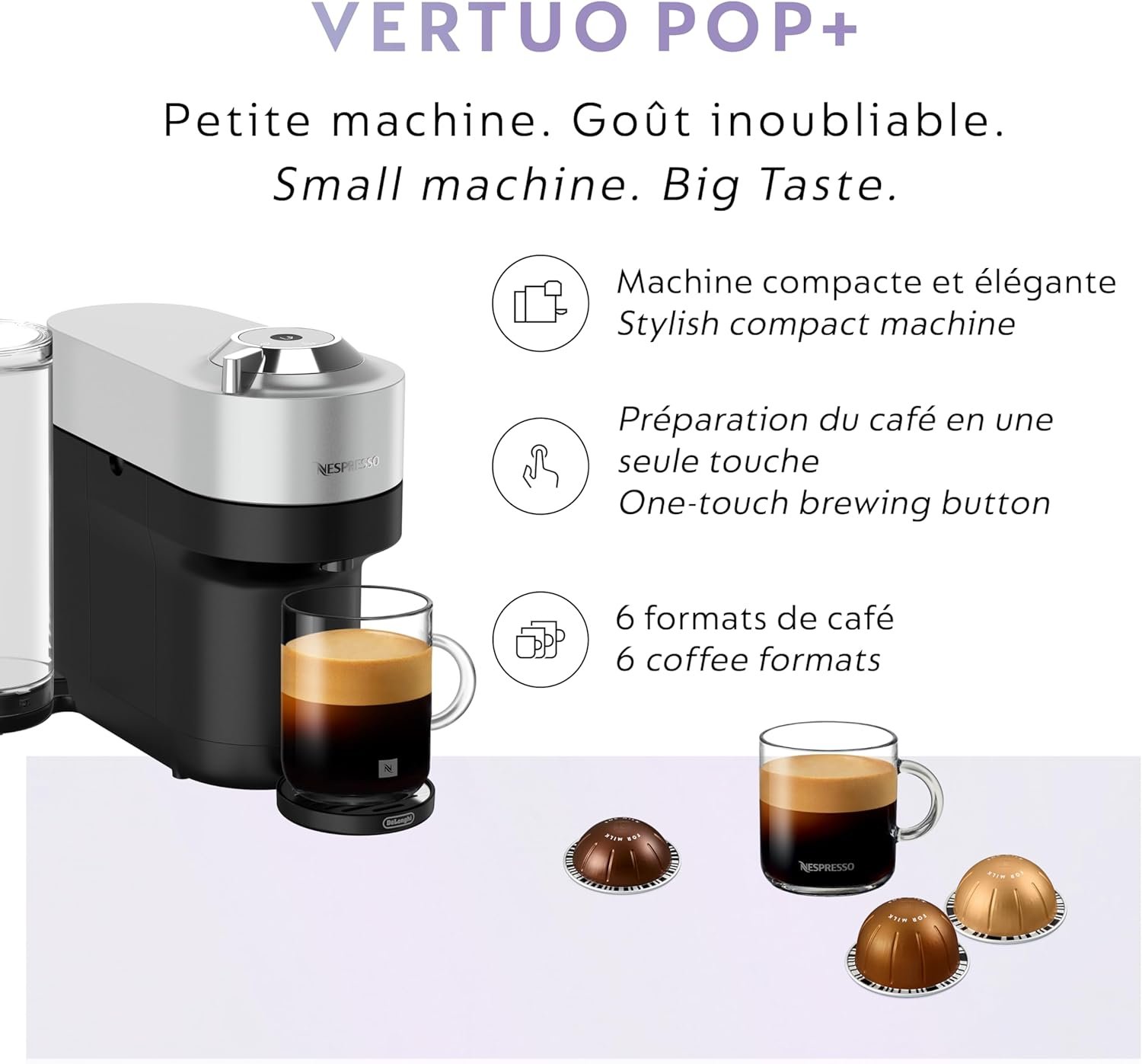 Add a touch of style to your life with the Nespresso Vertuo POP+ Deluxe machine. With its sleek design and elegant metallic finishing, Vertuo POP+ Deluxe makes a bold statement to match your style. With six cup sizes, from Espresso to Alto and Cold Brew style coffee, simply choose your Vertuo capsule, pop it in, and you’re away at the touch of a button. To keep you spinning, the machine reads the code on each capsule to reveal its hidden treasures, from aroma to crema. The Vertuo POP+ Deluxe has a large water tank (37.2 fl Oz) accessible from the side. All in a compact design. Always connected, the machine updates automatically, ensuring you get a smooth and consistent coffee experience. And to reduce its impact on the planet, it is made from 35% recycled plastic. For a coffee journey, with a POP+.