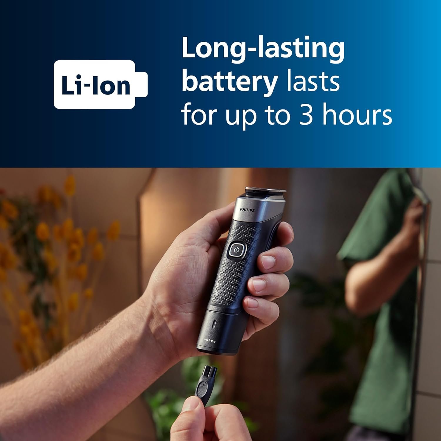 This Philips beard trimmer features the innovative Lift & Trim system that lifts and captures more lowlaying hairs for efficient, even trimming results. You will easily achieve the 3-day stubble, short beard or long beard – enjoy the look you really want. The self-sharpening steel blades stay as sharp and effective as on day 1 to deliver a perfect yet protective trim, time after time. Designed to prevent scratches and irritation, the blades have rounded tips for smoother skin contact. Philips Beard Trimmer 3000 Series cuts to the exact length you’re after. Just spin the zoom wheel to one of 20 length settings between 0.5 and 10mm in 0.5mm increments. The device is comfortable to hold and use, so you can handle those hard-to-reach areas more easily. When you want to clean the trimmer, detach the head and rinse it under the tap. Then dry it before you put it back on the appliance. A powerful lithium-ion battery provides up to 90 minutes of cordless grooming time after just 1 hour of charge. The 5-minute quick charge function gives you enough power for one trim. The battery indicators let you know what your battery status is: low, empty, charging or full. This way, you can charge your trimmer on time and fully, so you won’t end up with an empty battery in the middle of your trim.